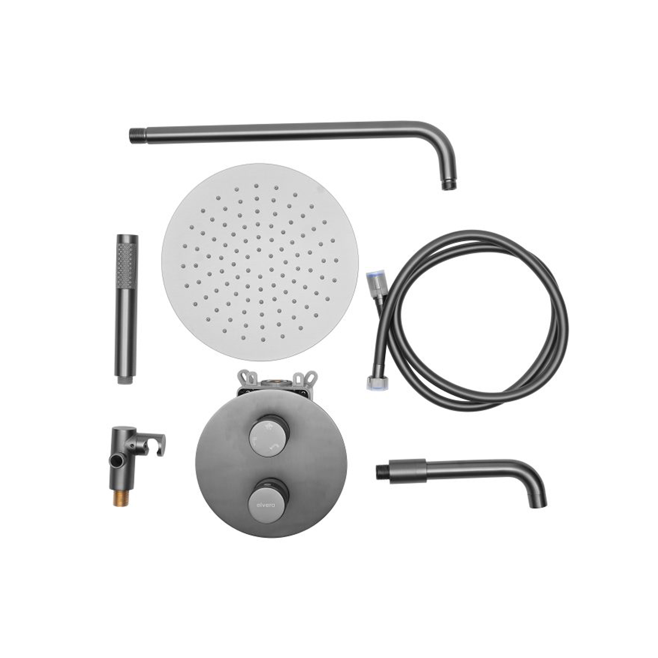 Set Includes : 8 inch Brass Shower , 16 inch Shower Arm, 3 Function Diverter, Spout, Elbow Outlet, Hand shower set